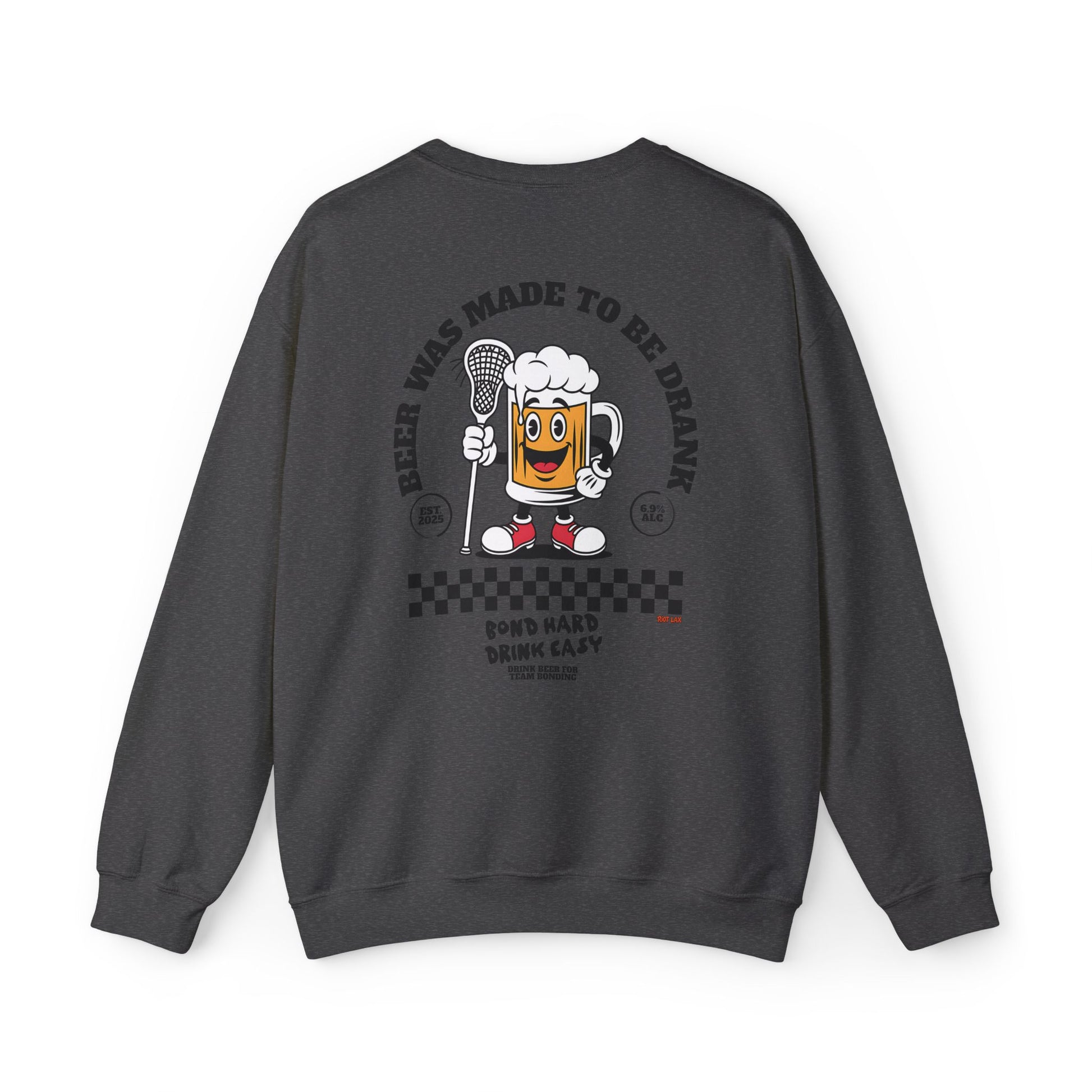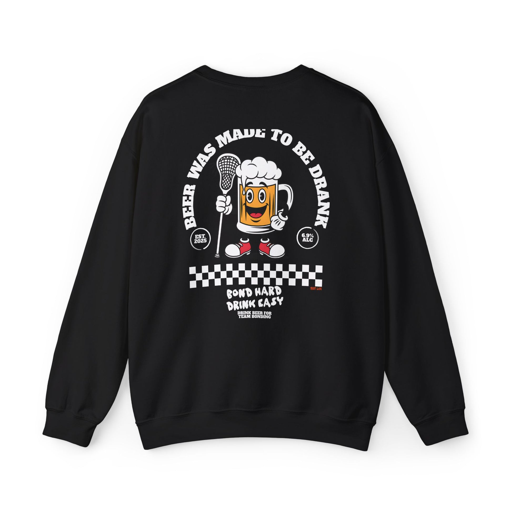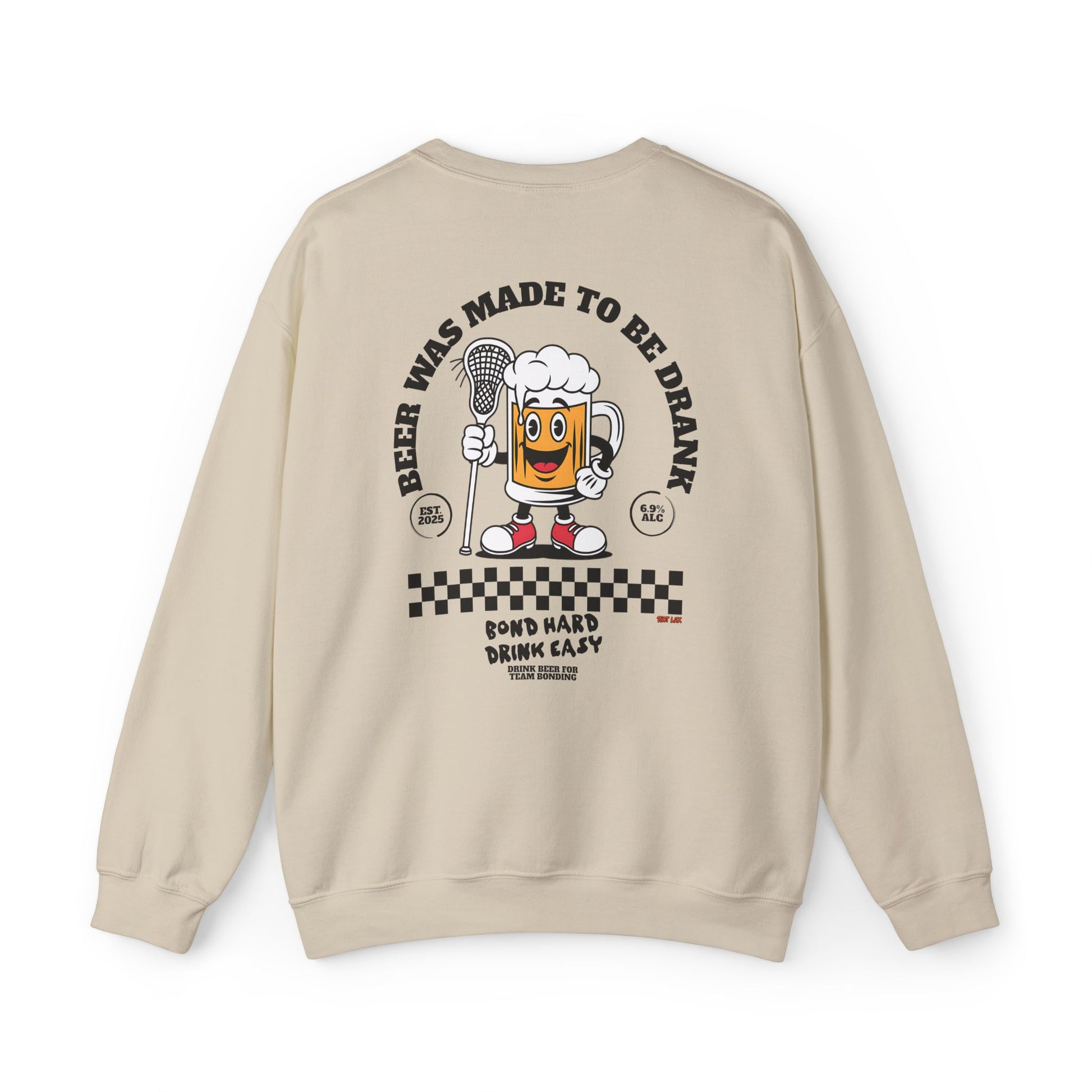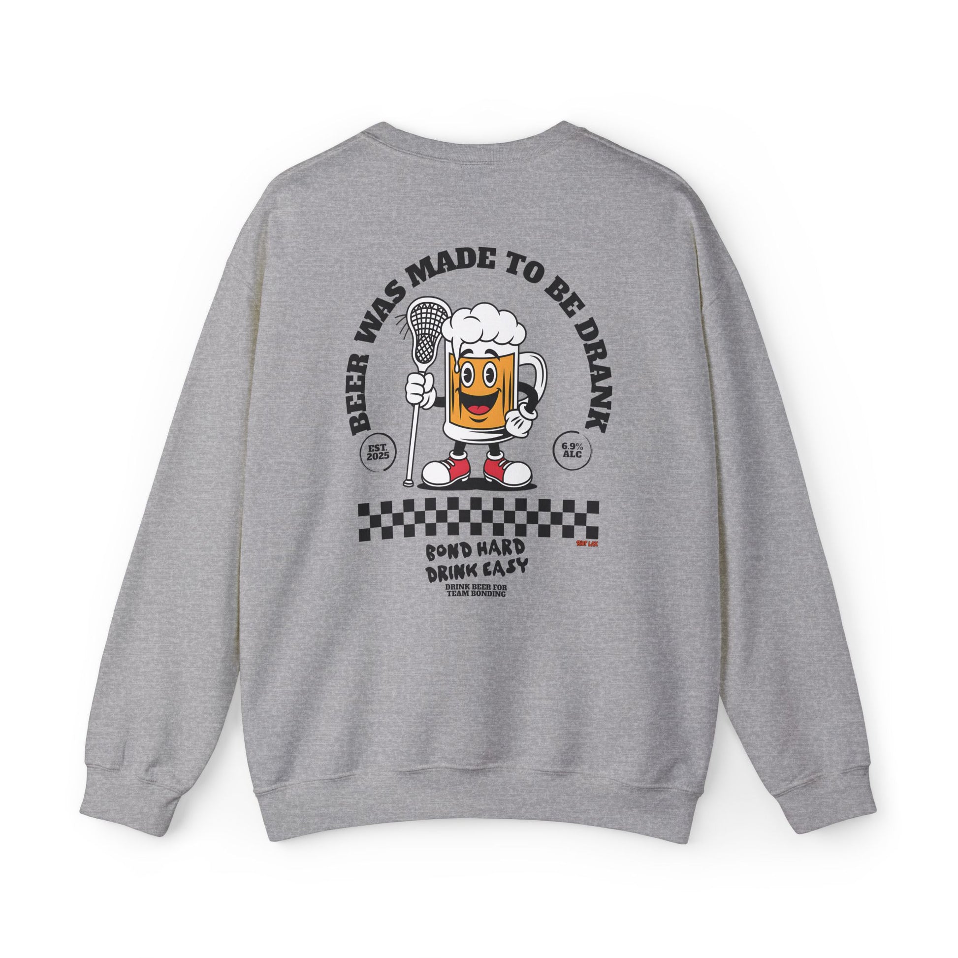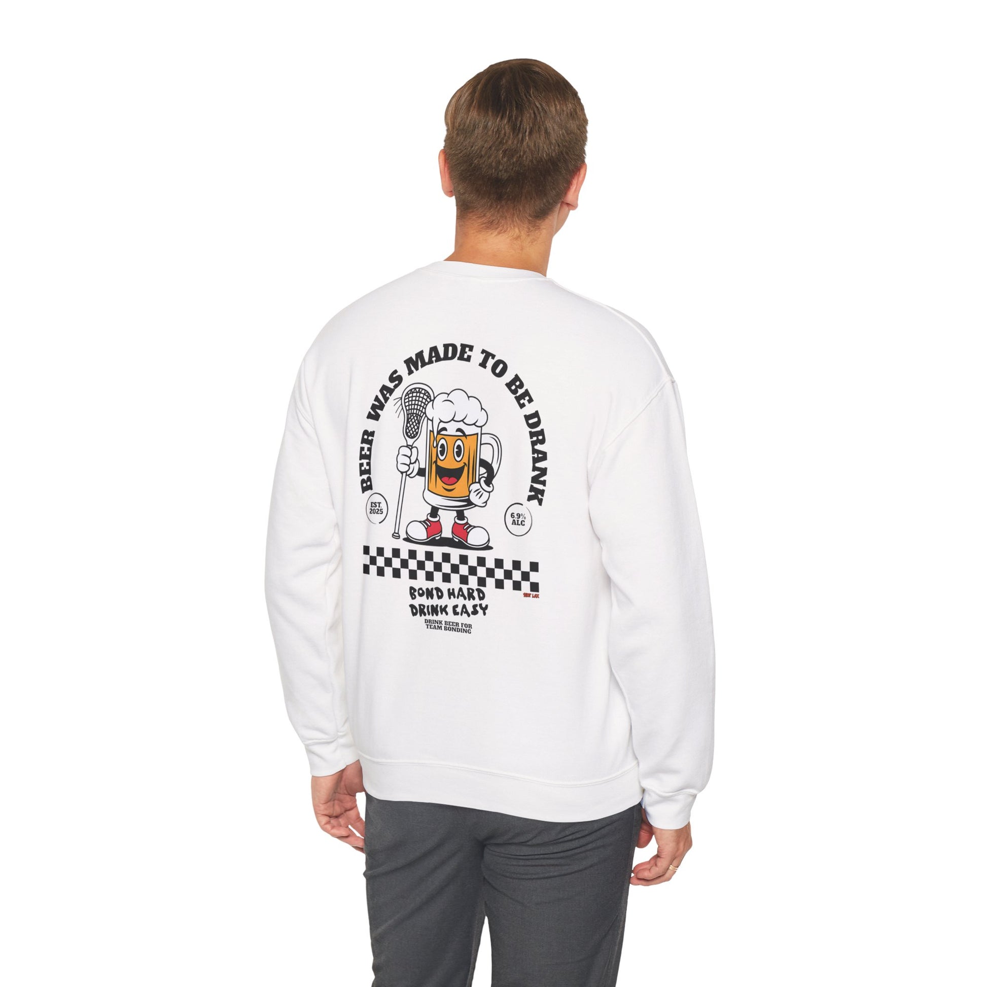 This cozy crewneck sweatshirt brings playful, retro energy to laid-back days and nights out. Soft yet sturdy, it wears like a favorite from the first pull-on and features a small, chest mark with bold artwork across the back: a smiling beer character holding a microphone, vintage checkerboard accents, and the cheeky slogan “Beer Was Made To Be Drank.” It feels like the soundtrack of an easy night — warm, slightly nostalgic, and made for laughing with friends. The classic fit and clean lines let the graphic pop without overpowering your look. Wear it to backyard barbecues, open-mic nights, brewery crawls, or whenever you want to lean into relaxed, spirited vibes.